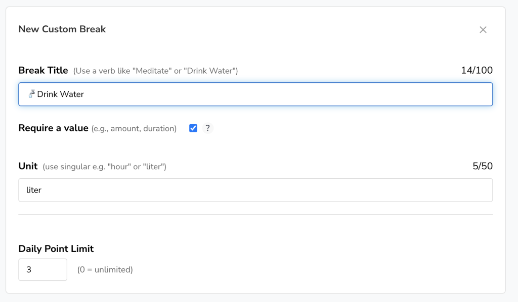 - If you would like to assign a value to the custom break, such as duration or quantity, check the box beside ‘Require a value’ and populate the ‘Unit’ field that appears. Use the singular form of the value, keeping in mind participants will earn 1 point for every value they accomplish