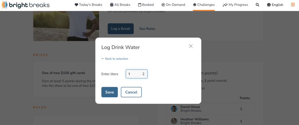 Here’s an example of a custom break where participants can earn one point per litre consumed up to three points per day:
