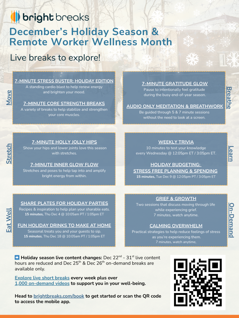 Here are scripts and Bright Breaks content you can use to promote wellness in December, covering holiday and remote worker wellness themes.
