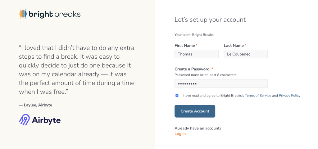 Visit brightbreaks.com/signup, enter your email associated with your organization, and click “Join your team”.