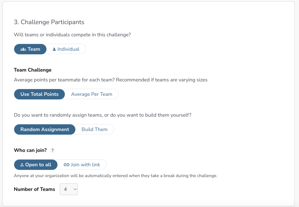 - NEW: if you would like to participants to ‘Join with Link’ – only those who join through the link will appear on, and be able to see, on the challenge leaderboard. Then Choose the number of Teams for the challenge