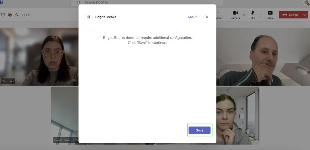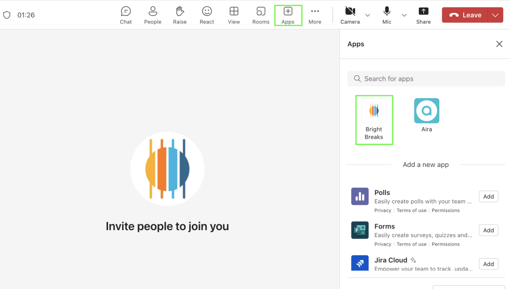 Step 2: Join a Teams Meeting and click ‘Apps’ at the top of the meeting window and then Bright Breaks when it appears on the right console.