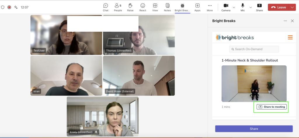 Step 4: Scroll through the pre-recorded breaks that appear on the left of the meeting window or use the search bar to select content to bring into the meeting and click ‘Share to Meeting’. The rest of the meeting participants will be able to see the break you selected unless they are not logged into a teams account or joining from a web browser.