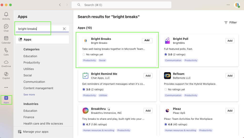 Step 1: Install the Bright Breaks app on MS Teams by clicking Apps, searching for Bright Breaks and clicking ‘Add’